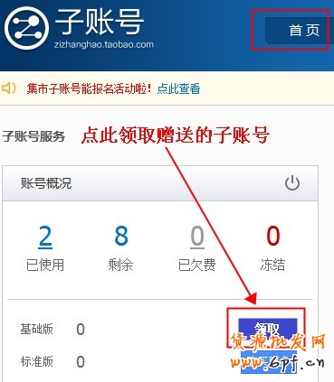 贈送的子賬號領取方式:進入子賬號后臺首頁,點擊“領取”,如圖3