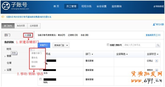 如圖6,按照店鋪的部門結構,在子賬號后臺菜單員工管理>部門結構中新建相應的部門,例如客服部、財務部、運營部等。
