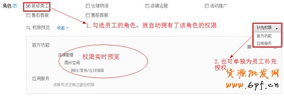 如圖10,勾選員工的角色(角色事先已創建并授權),或者選擇補充權限,該子賬號就擁有了相應的權限。【請注意一定要預覽檢查一遍子賬號的權限!!】