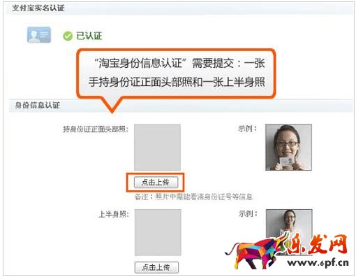 二、“淘寶身份信息認(rèn)證”需要提交:一張手持身份證正面頭部照和一張上半身照,點(diǎn)擊上傳;