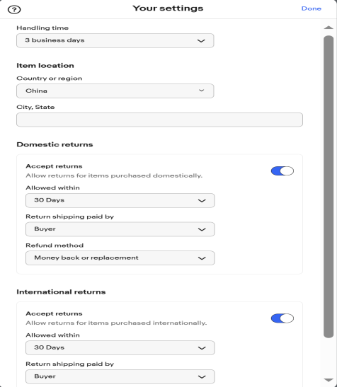 ★賣家也可以在商業(yè)政策中設置退貨政策模板,完成設置后,賣家在物品刊登創(chuàng)建的過程中便可直接根據(jù)模版中的退貨偏好進行選擇。