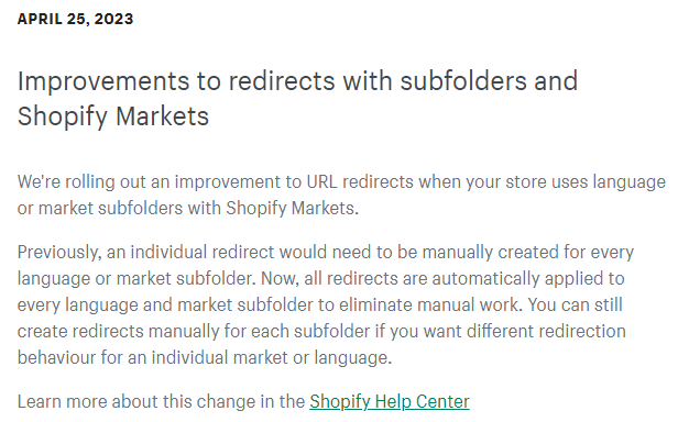 對于正在使用Shopify Markets的商家,此次URL重定向更新適用于所有語言或市場子文件夾。過去,當某一URL發生變化時,您需要為每種語言或市場子文件夾手動創建單獨的重定向?,F在,所有重定向都會自動應用,幫助您消除繁瑣工作,解放雙手、提升效率,且滿足多方需求。