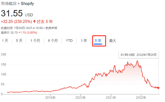 一系列的不利影響,導致Shopify業績大受影響,股價也大幅度下跌,由2021年11月的175美元峰值,跌到現在的30多美元,跌去了80%。